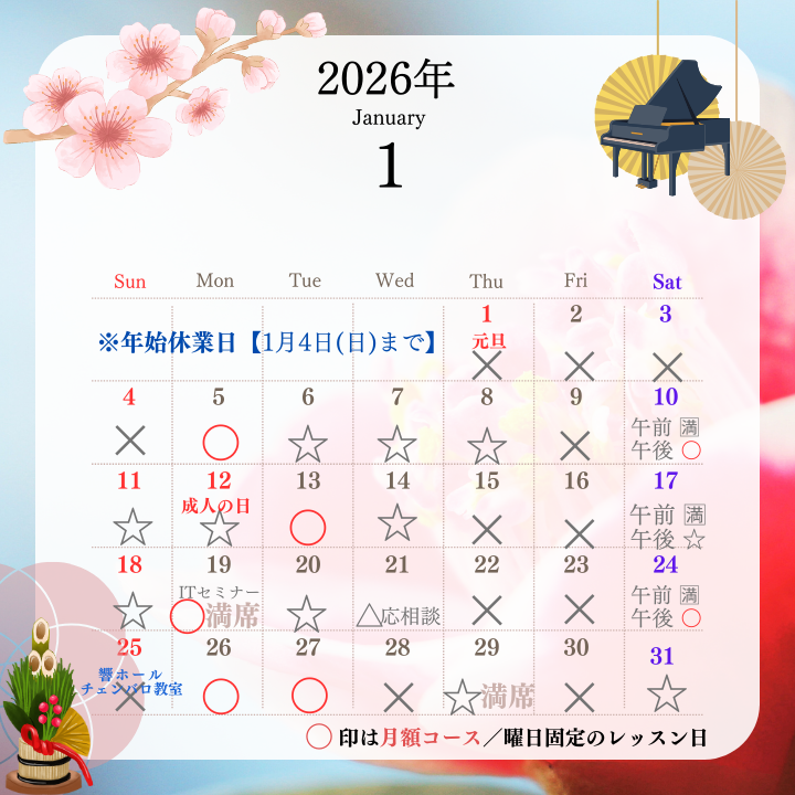 1月のピアノ教室開講(レッスン)日は下記のとおりです。